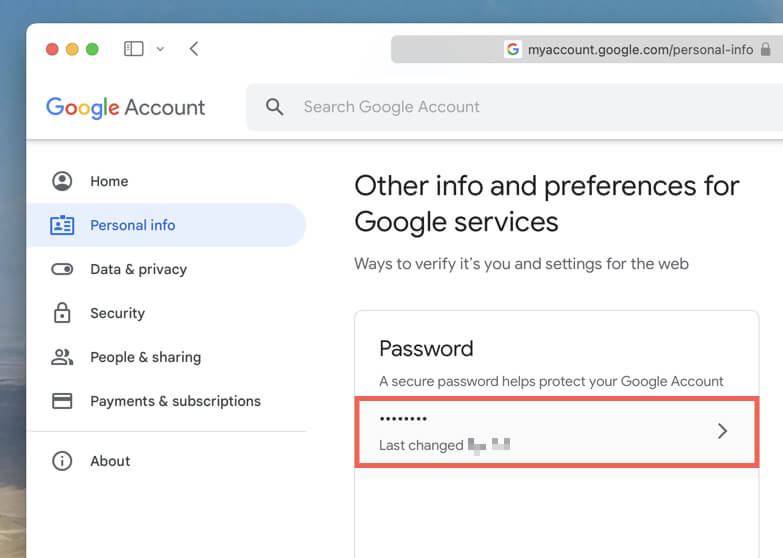 - 選擇個人信息在 Google 帳戶設置側欄上,然後向下滾動到Google 服務的其他信息和偏好設置部分並選擇密碼。
