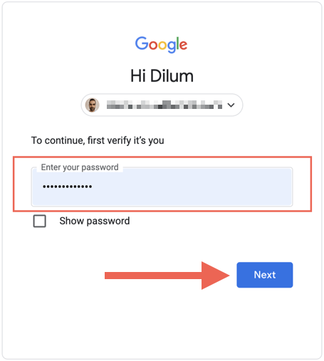 - 輸入您當前的密碼以驗證您的身份,然後選擇下一個。