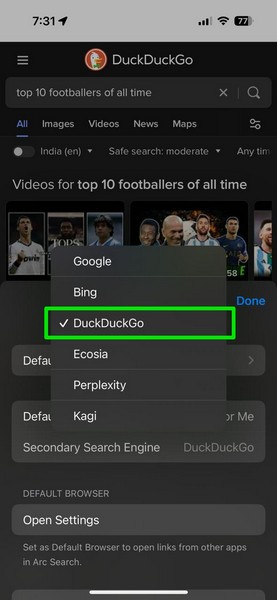 現在,每當您在 iOS 設備上的 Arc Search 中搜索網絡時,它都會使用您首選的搜索引擎而不是 Google。