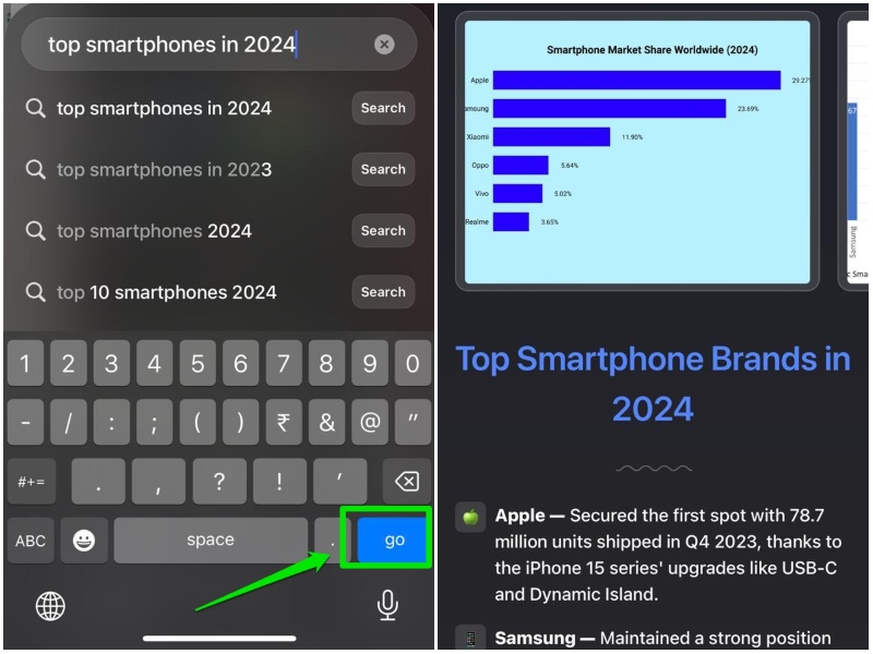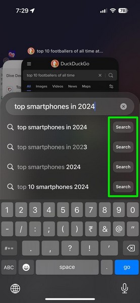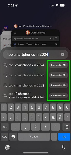 但是,如果您想查看搜索引擎上的搜索結果,您可以點擊建議搜索查詢旁邊的“搜索”按鈕。這就是為什麼你需要設置輔助搜索引擎什麼時候 將“為我瀏覽”選項設置為默認選項在 iPhone 上的 Arc Search 瀏覽器中。