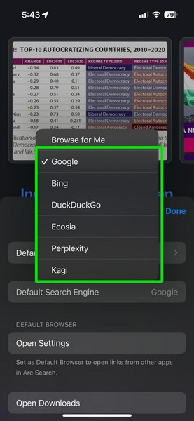 6.這裡,點擊您要使用的搜索引擎將其設置為 iPhone 上 Arc Search 中的默認搜索項即可。