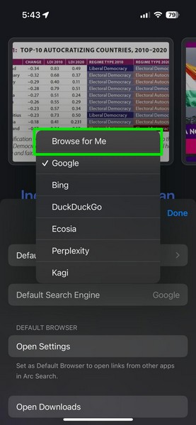 值得注意的是,除了傳統的搜索引擎外,您還可以在 iPhone 上的 Arc Search 中將“Browse for Me”設置為默認搜索引擎。然而,其中有一個問題,我將很快解釋。