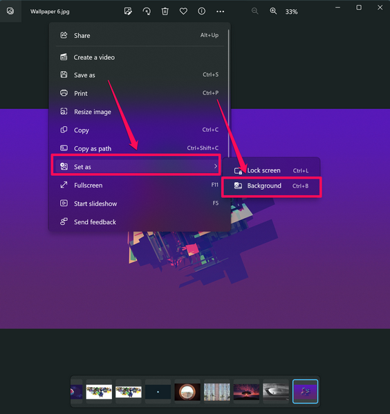 5.接下來,只需單擊背景以下子菜單上的選項可將所選圖像設置為 PC 或筆記本電腦上的桌面背景。