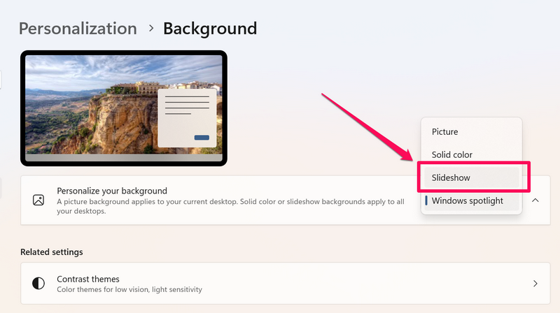因此,請按照以下步驟使用 Windows 11 中的幻燈片功能自動更改 Windows 11 電腦或筆記本電腦上的壁紙: