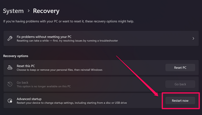 3.在接下來的頁面上,單擊立即重新啟動旁邊的高級啟動恢復選項部分下的選項。
