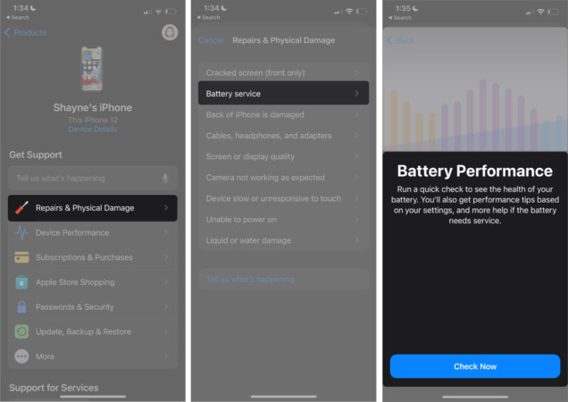 或者,您可以打開蘋果的支持應用程序 → 點擊維修和物理損壞→電池服務。您將可以快速檢查電池性能。現在,點擊立即查看。