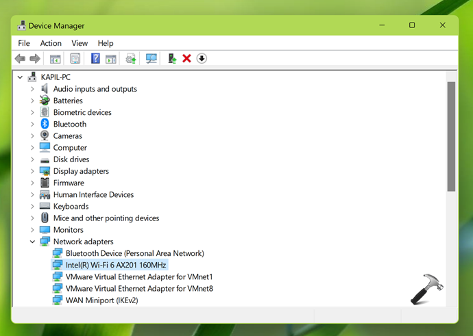 2.在設備管理器下,展開網絡適配器。找到您的主網絡適配器並右鍵單擊它並選擇特性。在此示例中,主適配器本身被命名為 Wi-Fi 6,因此這表明 WiFi 6 存在。如果主適配器名稱不同,您可以繼續下一步。