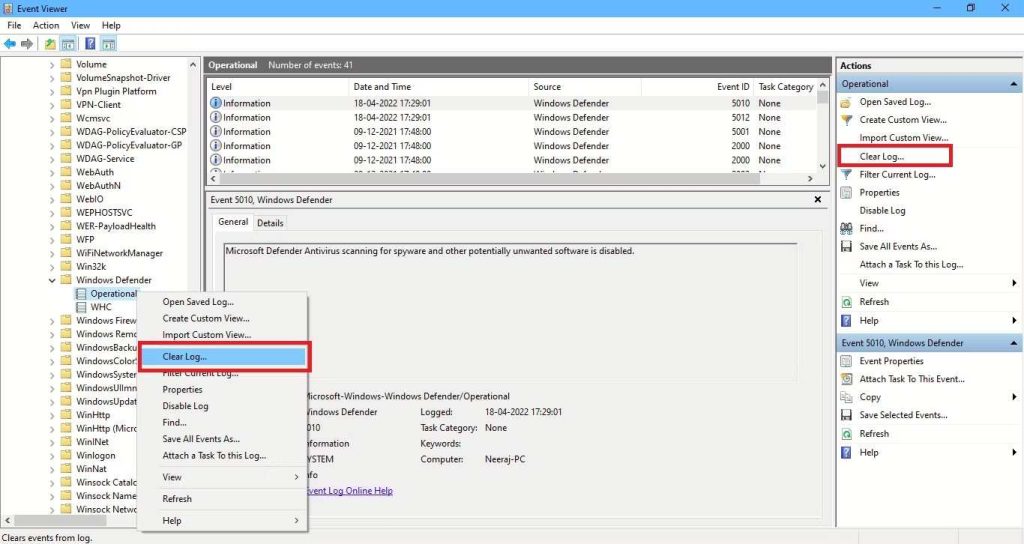步驟8:現在您可以選擇清除日誌右鍵單擊操作在左窗格中。