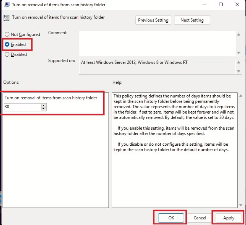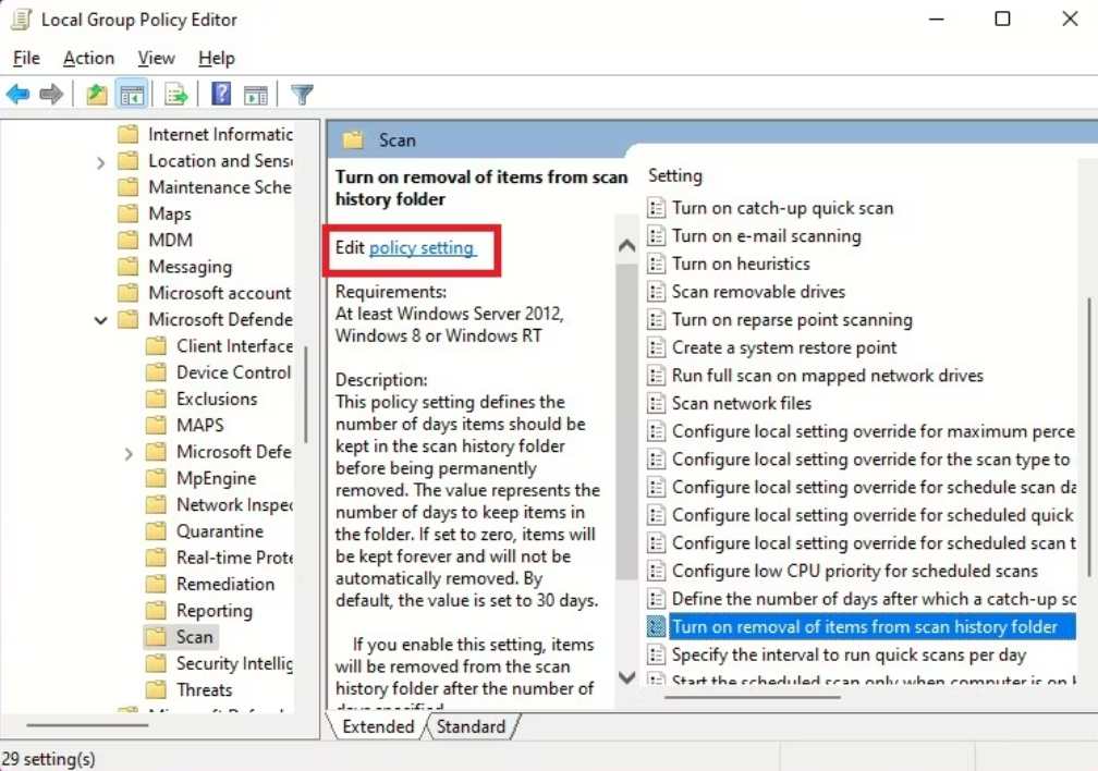 第7步:查看右側面板,單擊兩次“啟用從掃描歷史記錄中刪除項目” 政策制定。