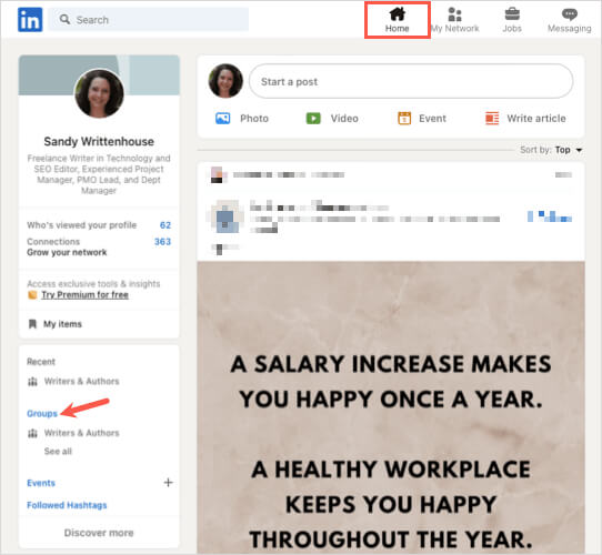 - 前往家LinkedIn 主頁上的選項卡並選擇團體在左下角。