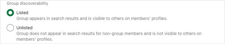 群組可發現性(必填):您可以選擇上市或者未上市對於這個選項。列出意味著該群組出現在搜索結果及其成員的個人資料中。不公開則相反,該群組不會出現在搜索中,並且在成員個人資料中不可見。