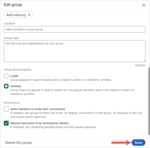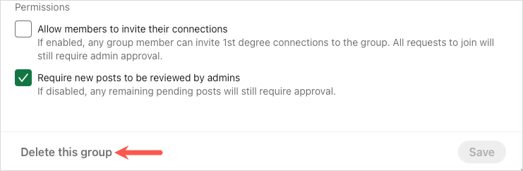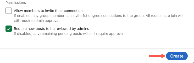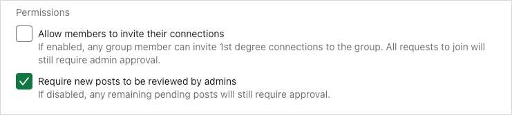 權限(可選):如果您想讓您的成員邀請他們的聯繫人,請選中第一個框;如果您想在帖子發布之前對其進行審閱,請選中第二個框。如果您確實選中了查看帖子的複選框,則您有 14 天的時間進行查看,之後該帖子才會對群組可見。