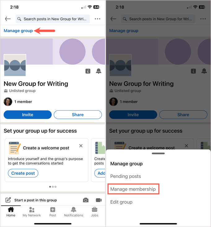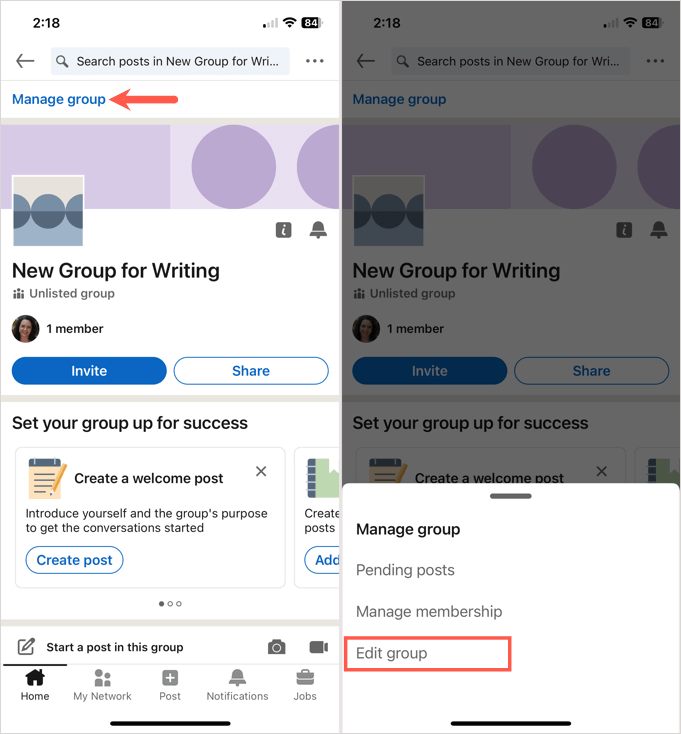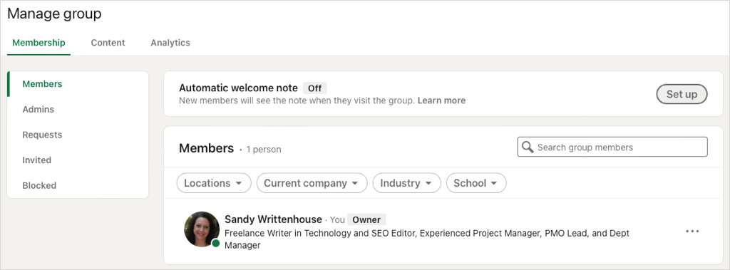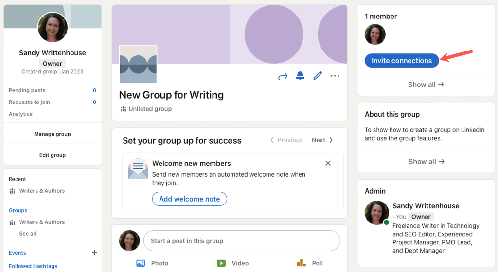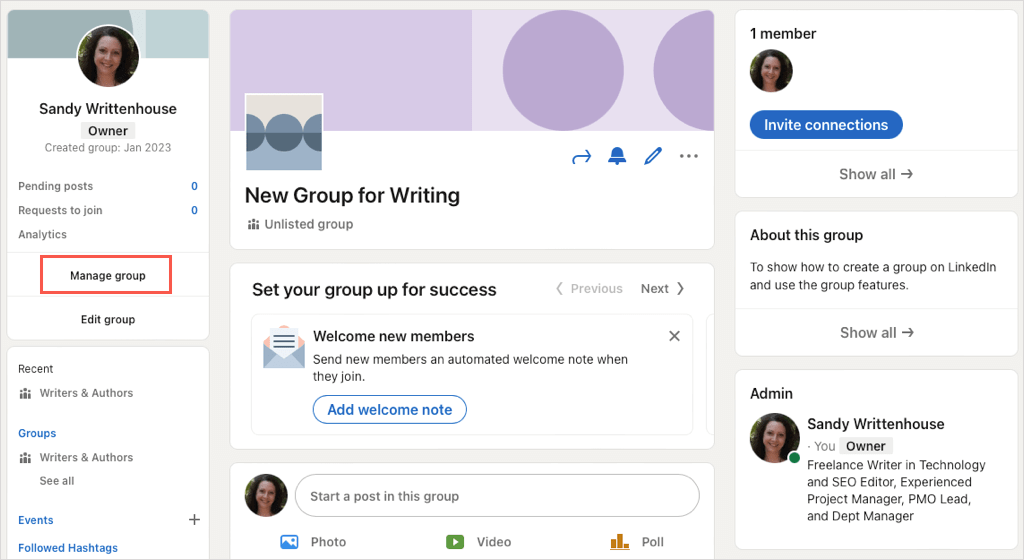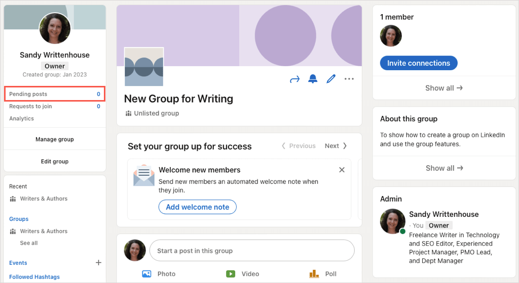 創建 LinkedIn 群組後,您可以邀請成員、編輯群組、查看待處理的帖子等。訪問您的小組的主頁即可開始。