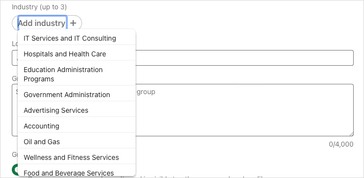 行業(可選):如果您想為該組添加相關行業,則最多可以添加三個。這對於特定行業和相關職業有幫助。