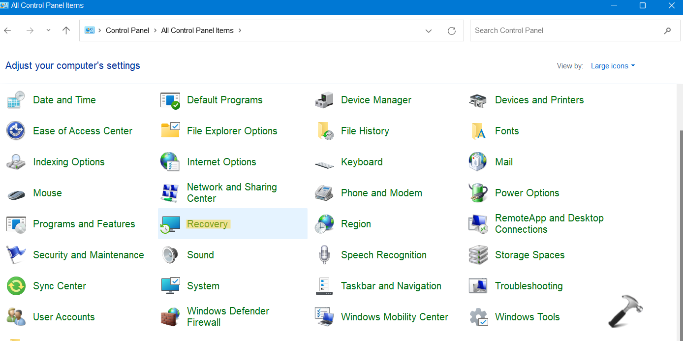 2.從所有控制面板項目窗口,單擊恢復選項卡。