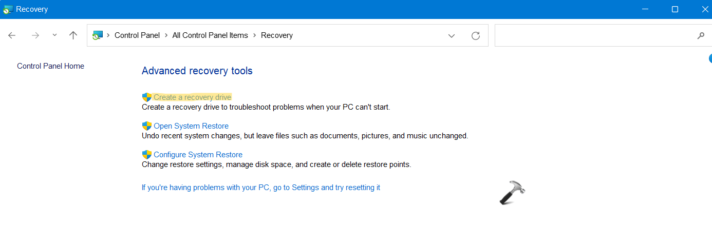3.之後,單擊創建恢復驅動器打開選項恢復驅動器。EXE文件。