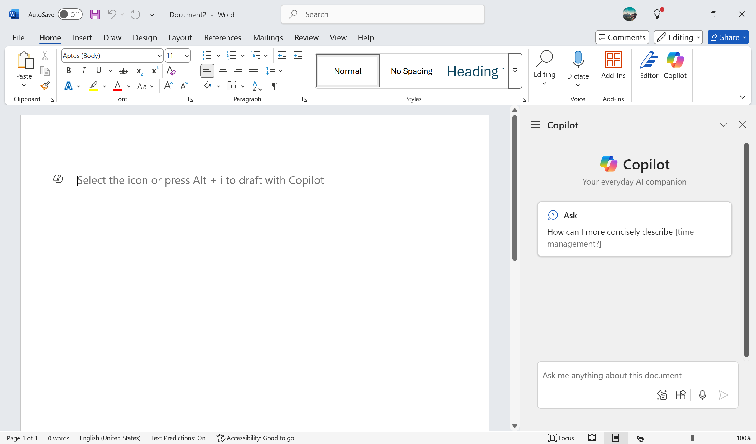 後者可以是任何東西。您可以詢問有關開放文檔的任何問題,獲取有關語法或風格的建議,或者詢問是否有不清楚的地方。副駕駛還可以提供拼寫建議。