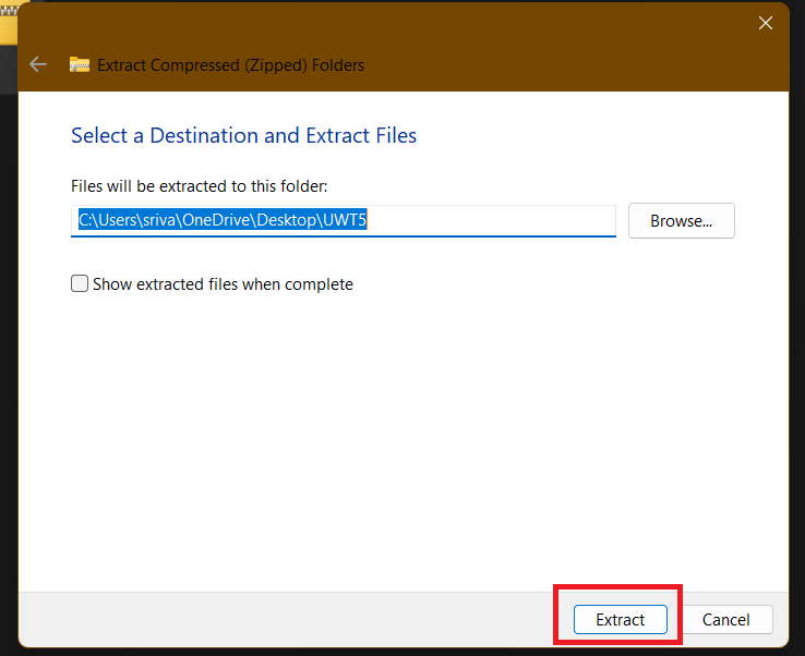 4.右鍵單擊UWT5zip 文件夾並選擇提煉全部選項。