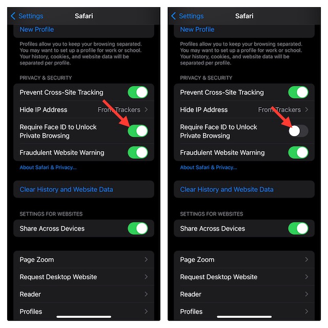 - 最後,關閉旁邊的開關需要 Face ID/Touch ID 才能解鎖私密瀏覽然後退出“設置”應用程序。