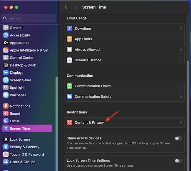- 現在,點擊屏幕時間並選擇“內容和隱私限制”。要繼續,請打開開關“內容和隱私限制”。