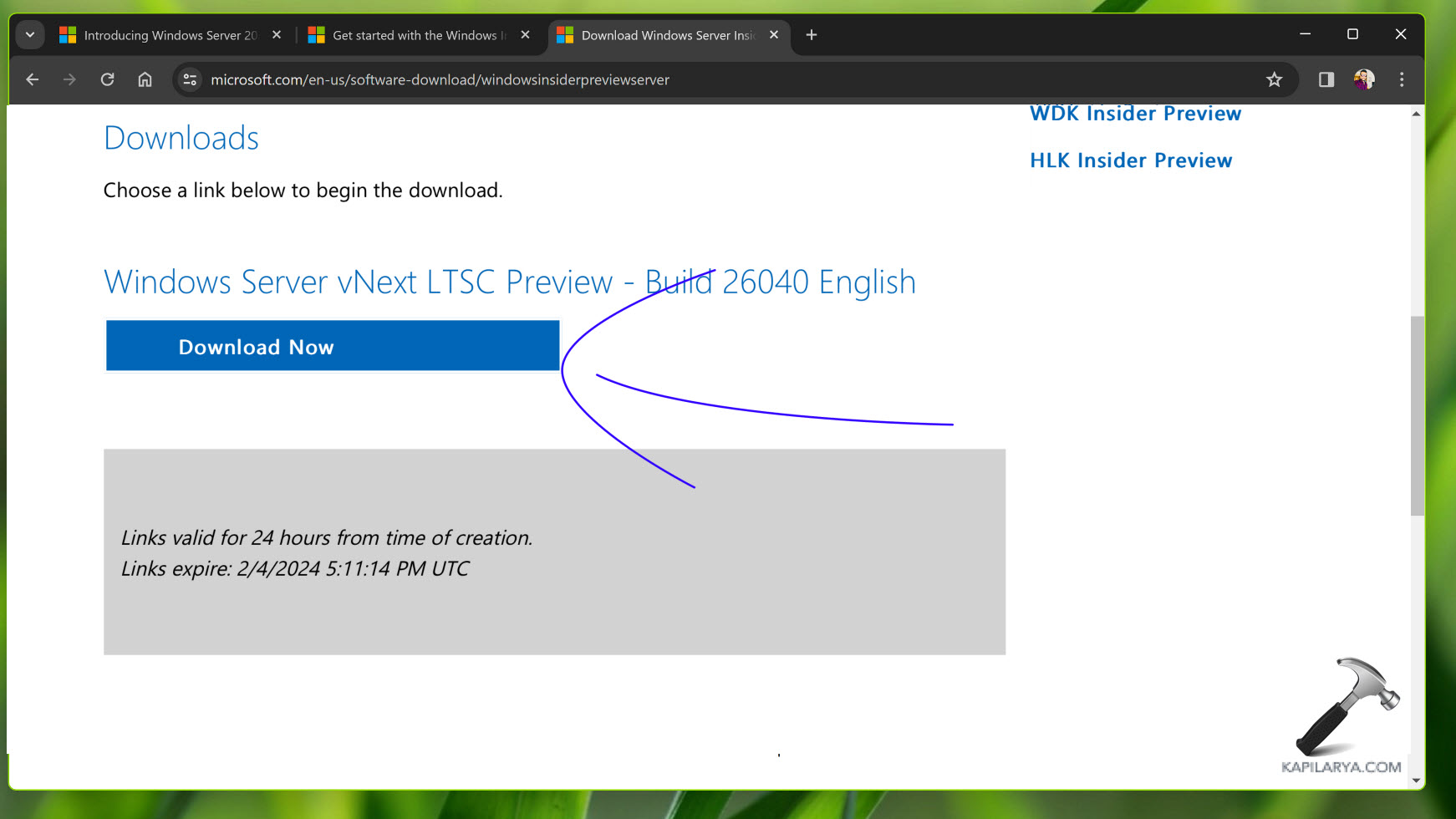 4. 最後,應該生成下載鏈接。您可以使用此鏈接下載 Windows Server Preview ISO 文件。此鏈接自創建之日起 24 小時內有效。您可以從任何設備、任何瀏覽器使用此鏈接。