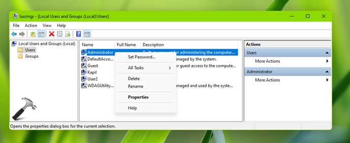 2. 在“本地用戶和組”管理單元中,轉到“用戶”文件夾並找到行政人員帳戶。右鍵單擊它並選擇特性。