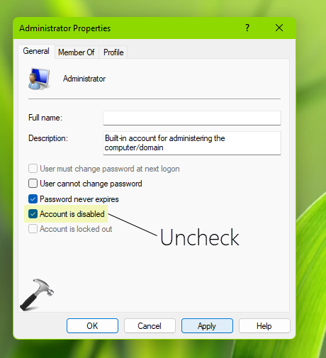 3. 在屬性表的“常規”選項卡上,取消選中帳戶已被禁用選項。單擊應用,確定。