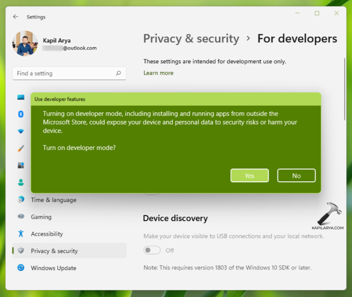 5.在實際啟用開發者模式之前,您將收到確認提示,單擊是的在那。如果您在此提示上單擊“否”,則不會啟用開發人員模式。