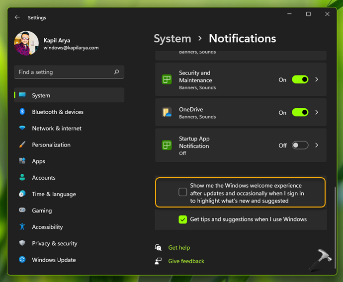- 在“通知”下,轉動離開這在更新後以及偶爾在我登錄時向我顯示 Windows 歡迎體驗,以突出顯示新增功能和建議選項。