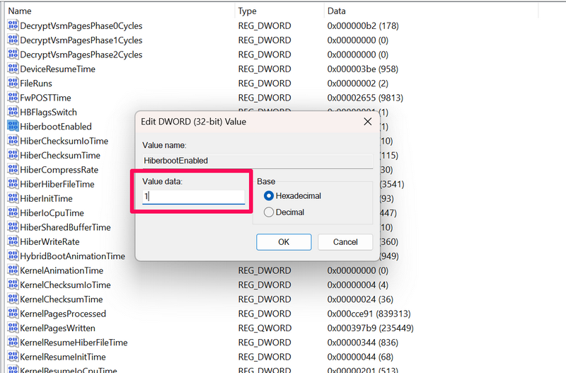 8.如果你想稍後在您的 PC 或筆記本電腦上重新啟用快速啟動,您可以按照以上步驟操作打開 HiberbootEnabled 屬性,將值數據從 0 更改為 1再次,然後重新啟動您的 Windows 11 設備。
