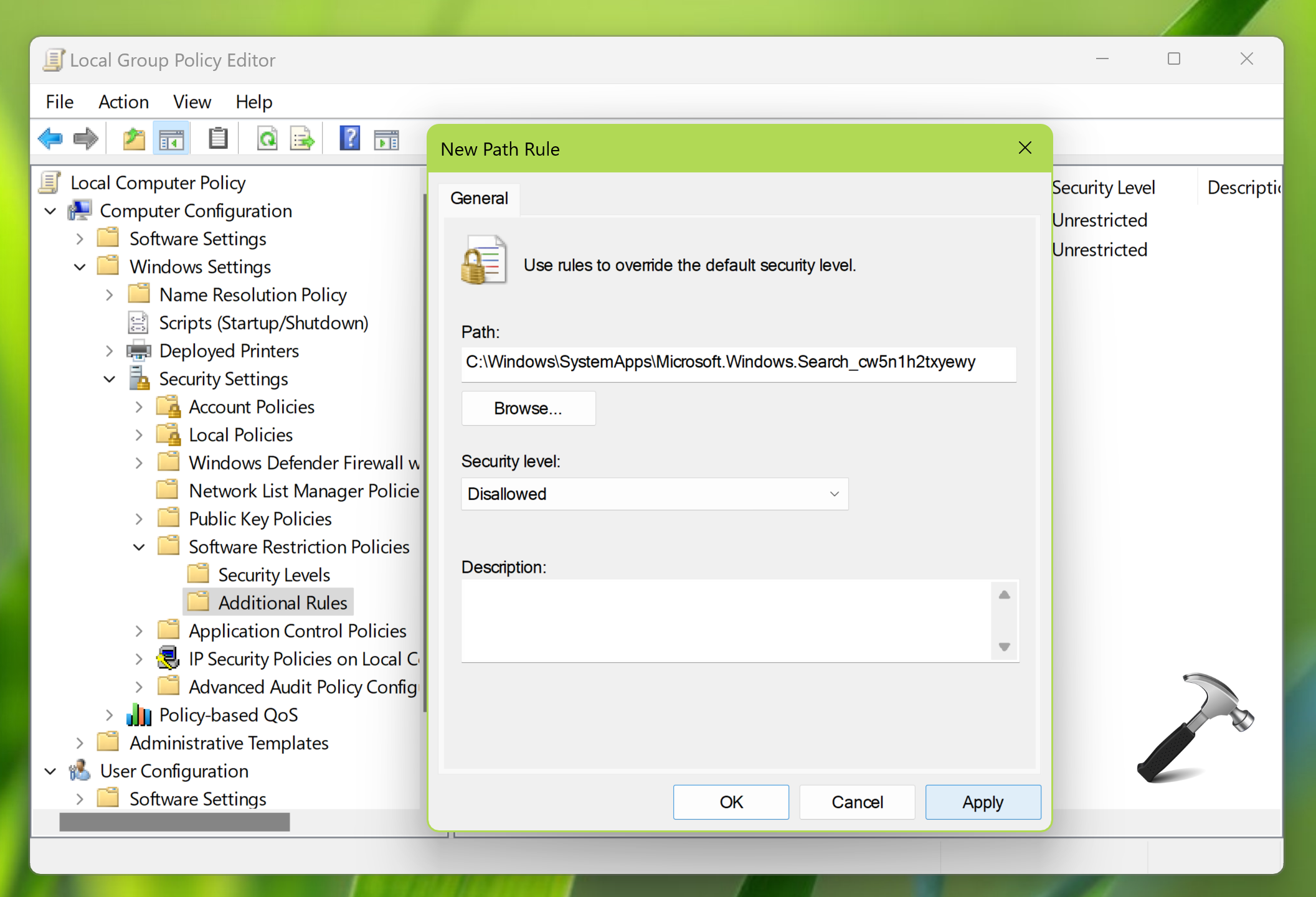 3.如果沒有定義軟件限制策略,單擊操作 > 新軟件限制策略。然後轉到軟件限制策略 > 其他規則。在右側窗格中,右鍵單擊並選擇“新建路徑規則”。輸入路徑為C:WindowsSystemAppsMicrosoft.Windows.Search_cw5n1h2txyewy。單擊應用,確定。