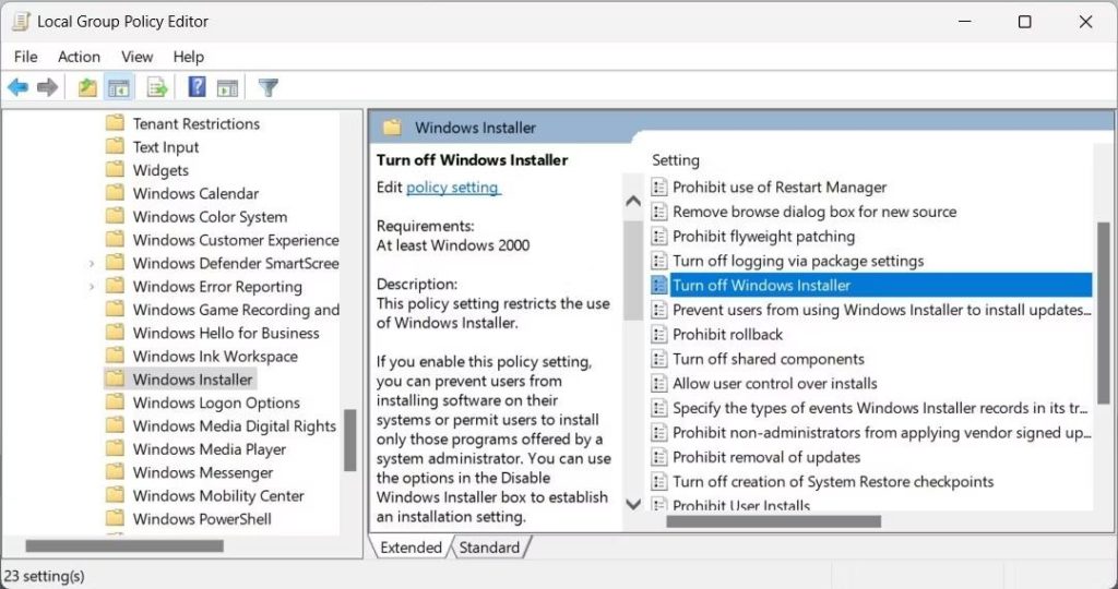第4步:雙擊右側面板上標有“關閉 Windows Installer”的策略。