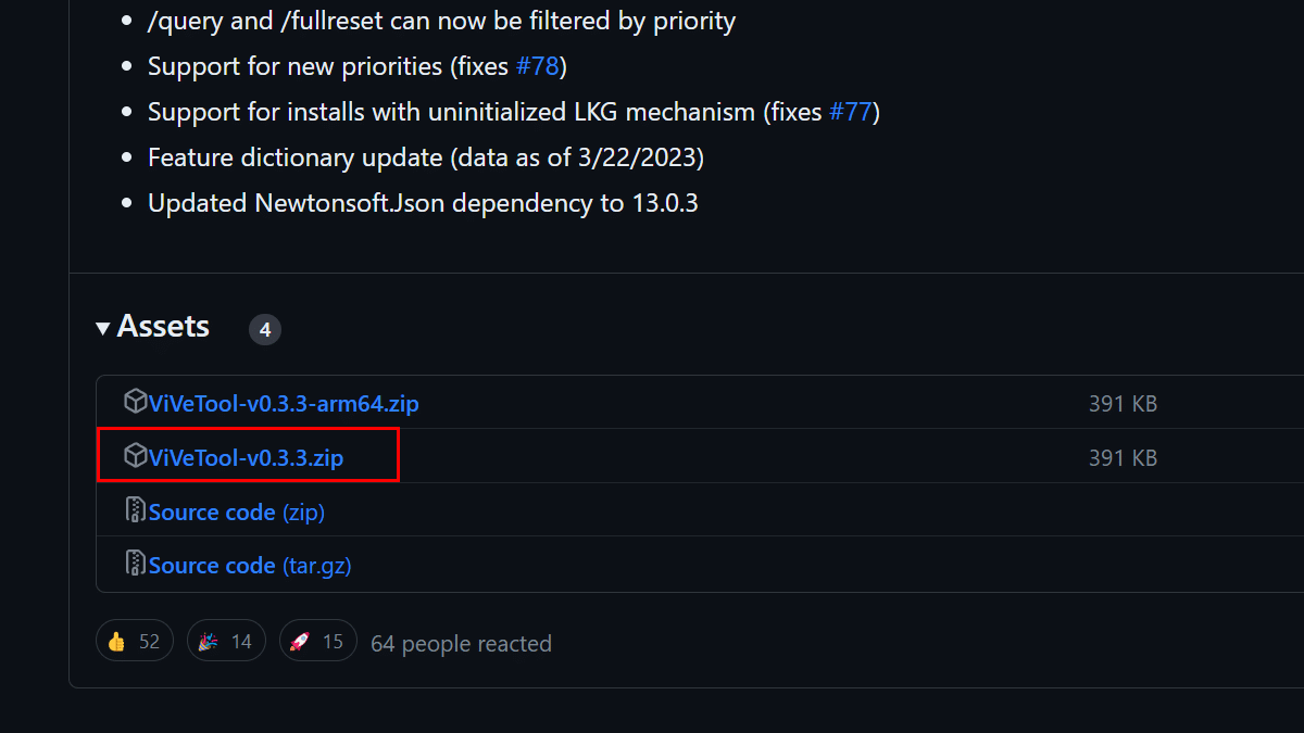 - 打開GitHub網站並下載ViveTool-vx.xxzip文件。