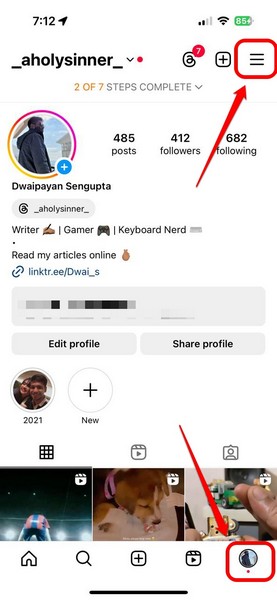 2. 點擊您的個人資料圖標並點擊底部導航欄上的設置和活動(三欄)按鈕在右上角。