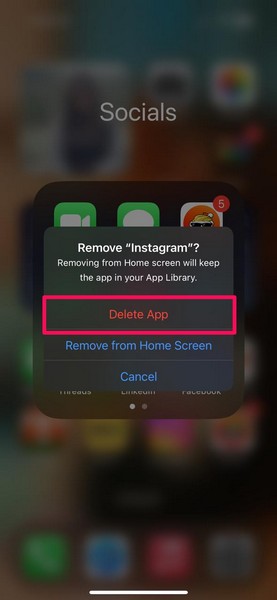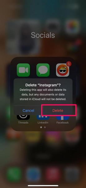 4. 確認您的操作在下一個提示中卸載 Instagram 應用程序。