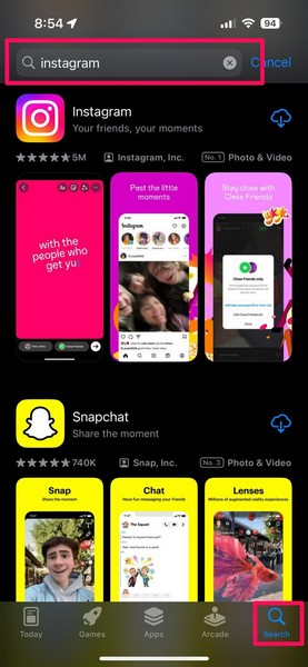 6.前往搜索選項卡在底部導航欄上並使用上面的搜索欄找到 Instagram 應用程序。