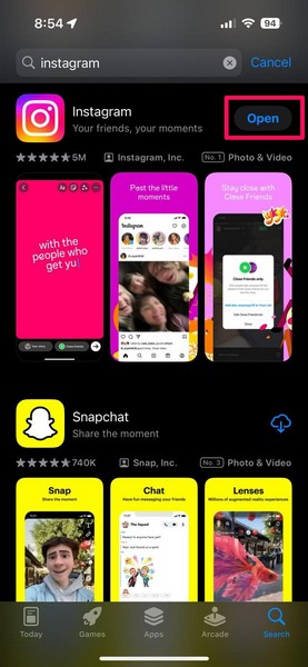 8.等待應用程序下載並安裝到您的設備上,然後點擊打開按鈕啟動 Instagram。
