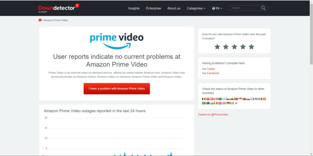 要檢查 Amazon Prime Video 的服務器狀態,請單擊並滾動到過去 24 小時內報告的 Amazon Prime Video 中斷情況部分並檢查人們在您也遇到問題時是否報告了 Amazon Prime Video 的一些問題。