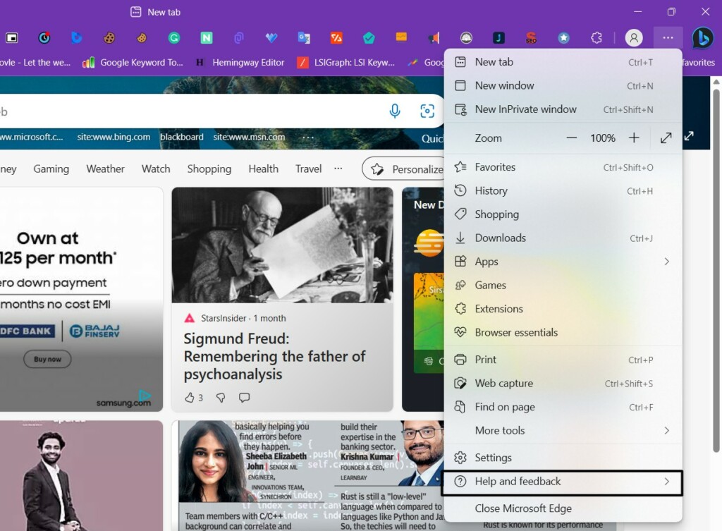 2.將箭頭懸停在幫助和反饋在菜單中並選擇關於微軟邊緣從它。