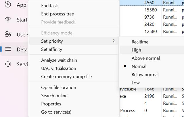 第4步:再次右鍵單擊該進程,這次選擇“設置優先級”,然後單擊“高”。