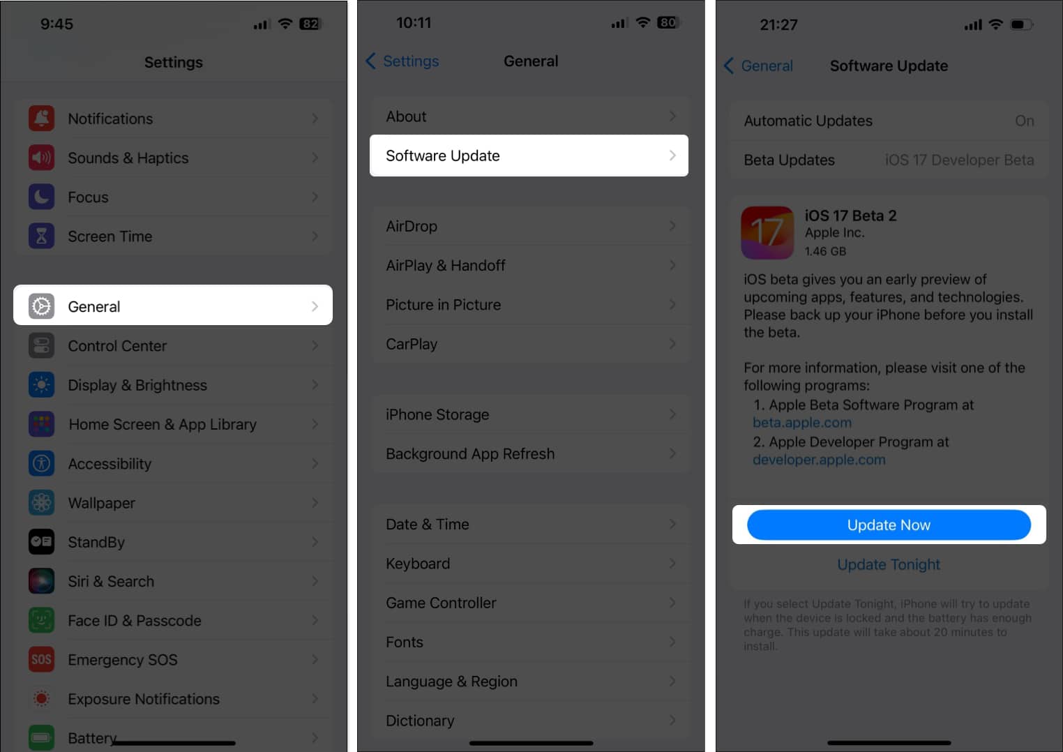 Apple Music 的動畫封面藝術功能是 iOS 17 或更高版本獨有的。因此,將您的設備更新到最新的 iOS 版本至關重要。為此,請轉至設定→一般的→軟件更新→ 點擊立即更新如果有更新可用。
