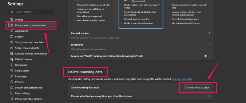 3.下隱私、搜索和服務選項卡在左側導航欄中,單擊選擇要清除的內容按鈕旁邊的立即清除瀏覽器數據選項根據刪除瀏覽數據部分。