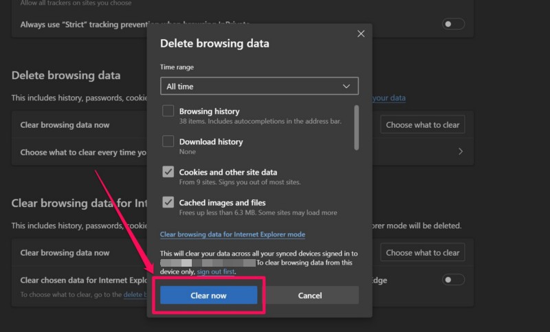 4.在以下窗口中,確保時間範圍設置為所有時間和複選框為Cookie 和其他網站數據和已檢查緩存圖像和文件選項。您還可以選中其他復選框到刪除所有瀏覽器數據。