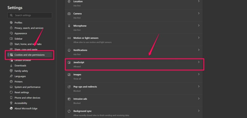 3.接下來,單擊Cookie 和站點權限選項卡點擊左側導航欄,打開JavaScript 設置從右窗格中。
