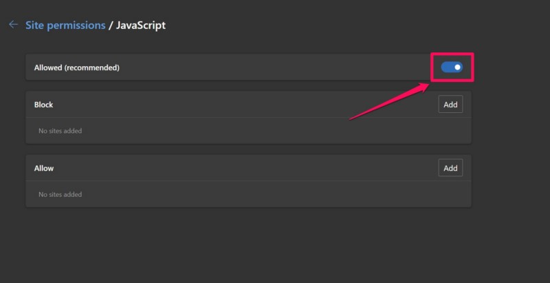 完成後,關閉瀏覽器中的“設置”選項卡,然後重新加載生成“應用程序錯誤:發生客戶端異常”錯誤的頁面。重新加載後,檢查網頁是否正常加載。如果是這樣,您可以在瀏覽器中重新打開 JavaScript 設置頁面並重新啟用該設置。