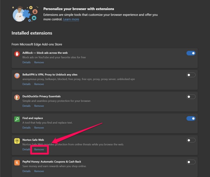 3.在下一頁上,找到您最近添加的擴展程序到瀏覽器並點擊刪除按鈕就在它下面。