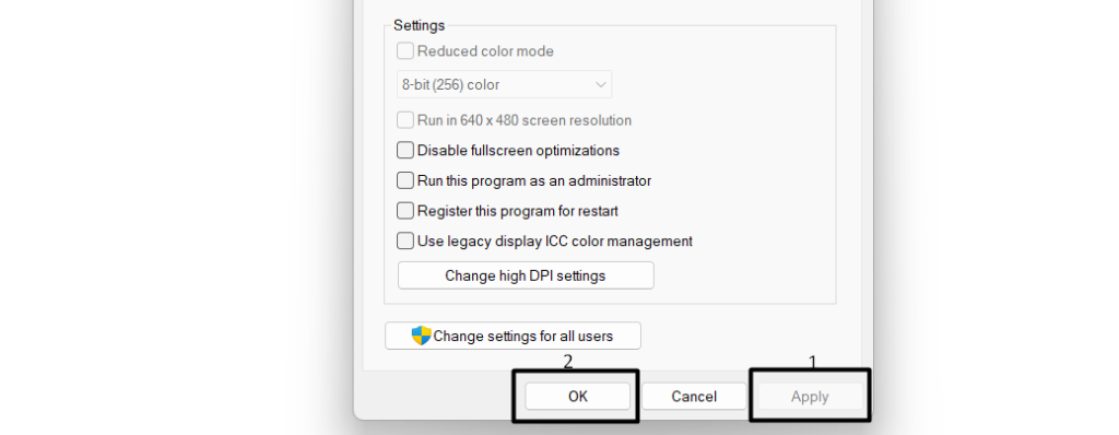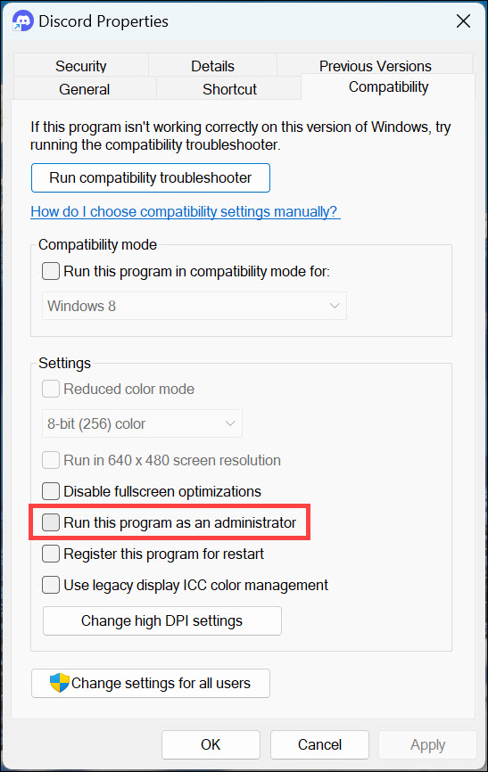 3.在特性窗口,轉到相容性選項卡並檢查其中提到的選項: