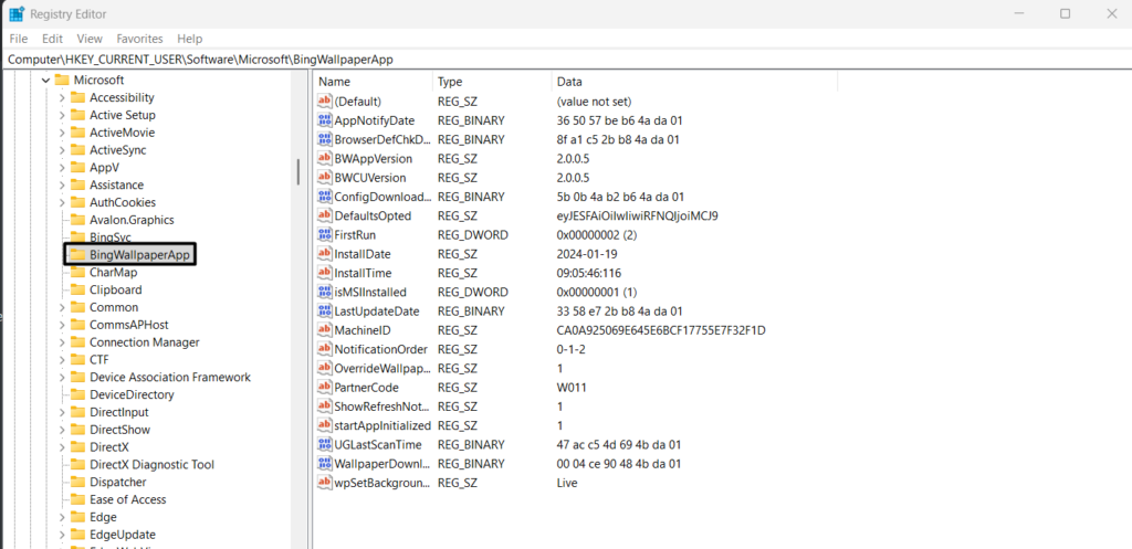ComputerHKEY_CURRENT_USERSOFTWAREMicrosoftBingWallpaperApp。