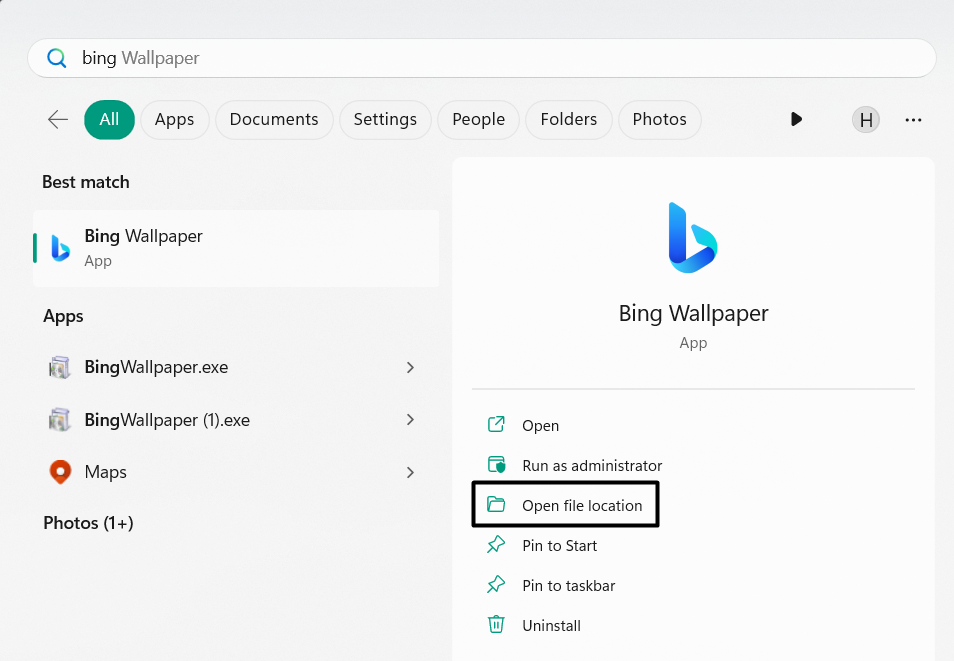 2.在上下文菜單中,單擊打開文件位置,然後右鍵單擊必應壁紙EXE文件。