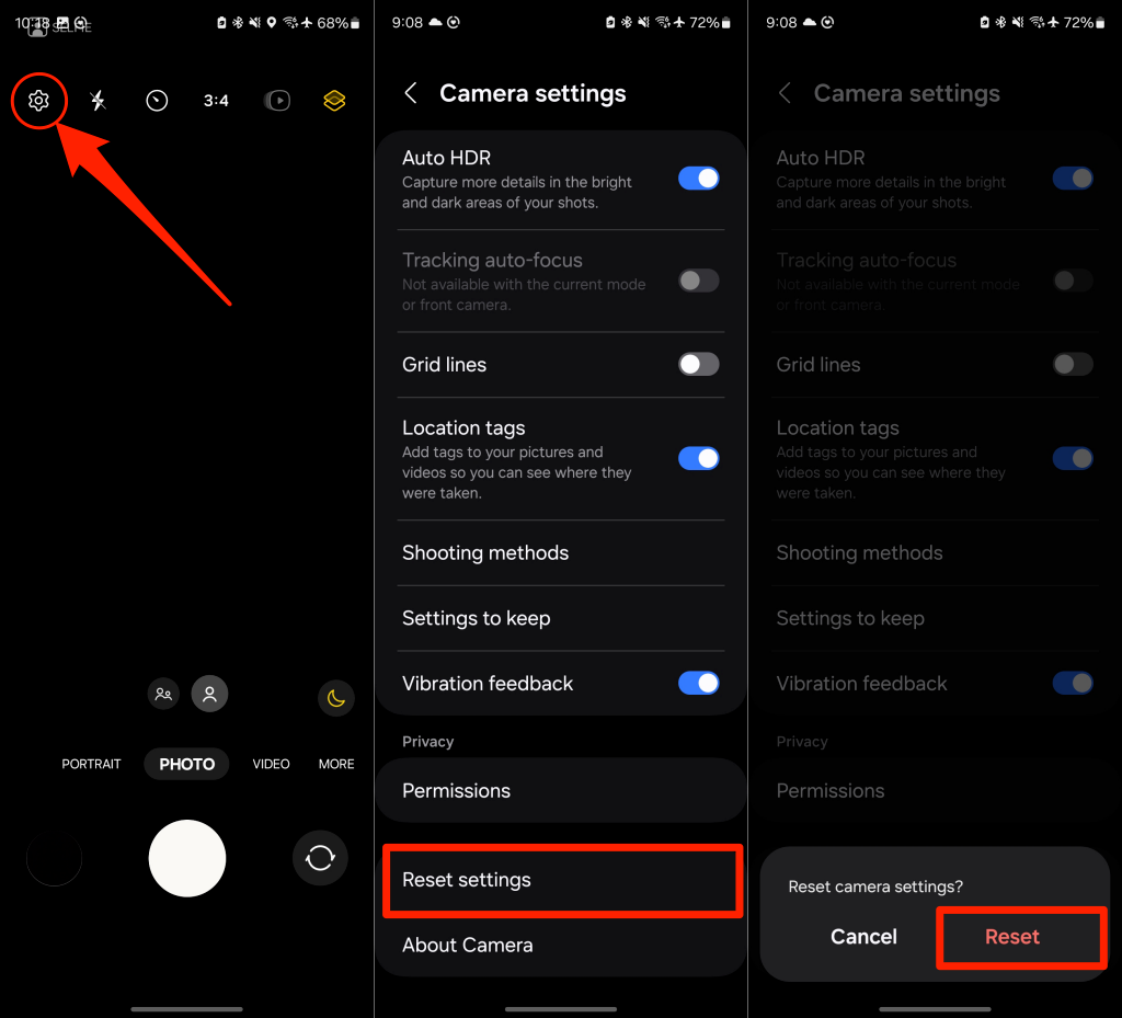 打開相機應用程序,點擊設置圖標,並選擇重置設置(或將相機重置為默認設置的類似選項。)